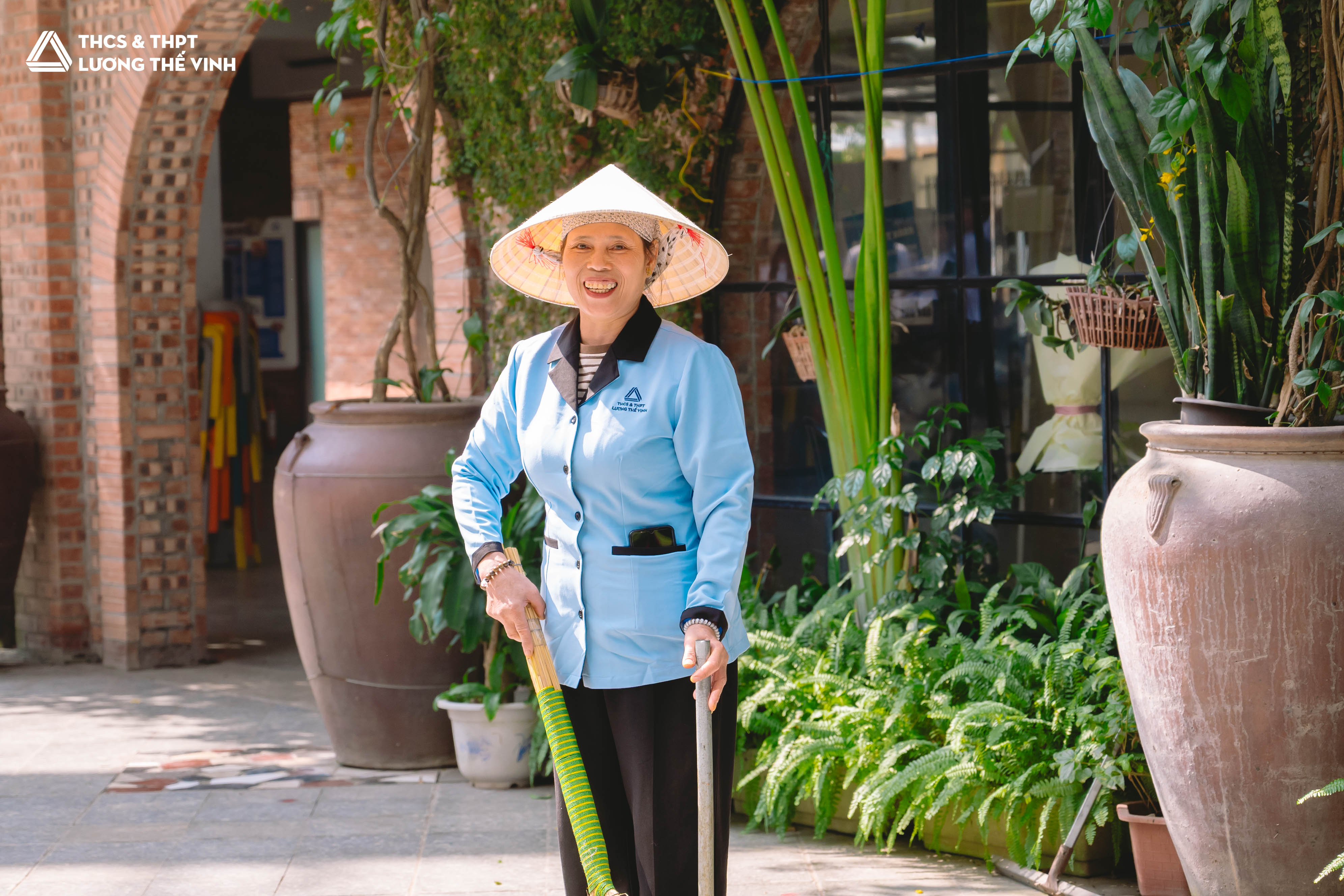 Nếu câu chuyện của cô Hà An gợi lên niềm tự hào, thì hành trình của cô Vũ Thị Vân – người lao công đã lặng lẽ gắn bó 7 năm lại thắp sáng một vẻ đẹp bình dị mà ấm áp. Giữa bao ngày nắng mưa, đôi tay cô trở nên chai sạn, nhưng bù lại, cô nhận về những điều vô giá: sự lễ phép của học trò, ánh mắt tôn trọng và những tiếng chào thân thương mỗi sớm mai. “Chỉ cần các em cúi đầu chào, gọi đúng tên, tôi đã thấy công việc của mình đầy ý nghĩa,” – cô nói. Với cô Vân, niềm tự hào lớn nhất không chỉ là góp phần giữ cho trường lớp sạch sẽ, tươm tất, mà còn là được làm việc dưới mái nhà Lương Thế Vinh – nơi ban giám hiệu luôn yêu thương, quan tâm và giúp đỡ tận tình. Chính sự tin tưởng và sẻ chia ấy đã trở thành động lực, giúp cô thêm gắn bó, thêm vững tin để cống hiến bằng tất cả tình thương và tâm huyết.