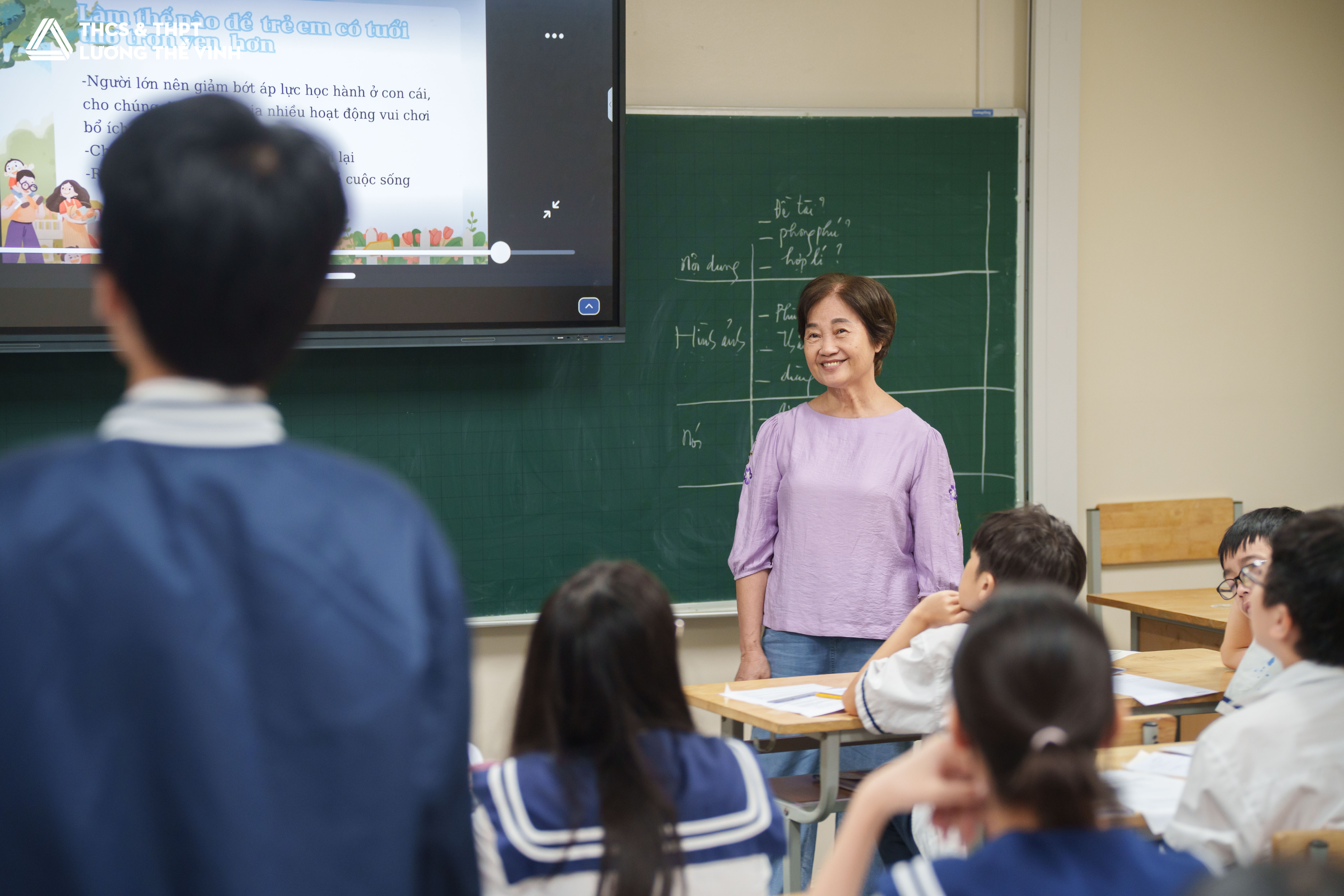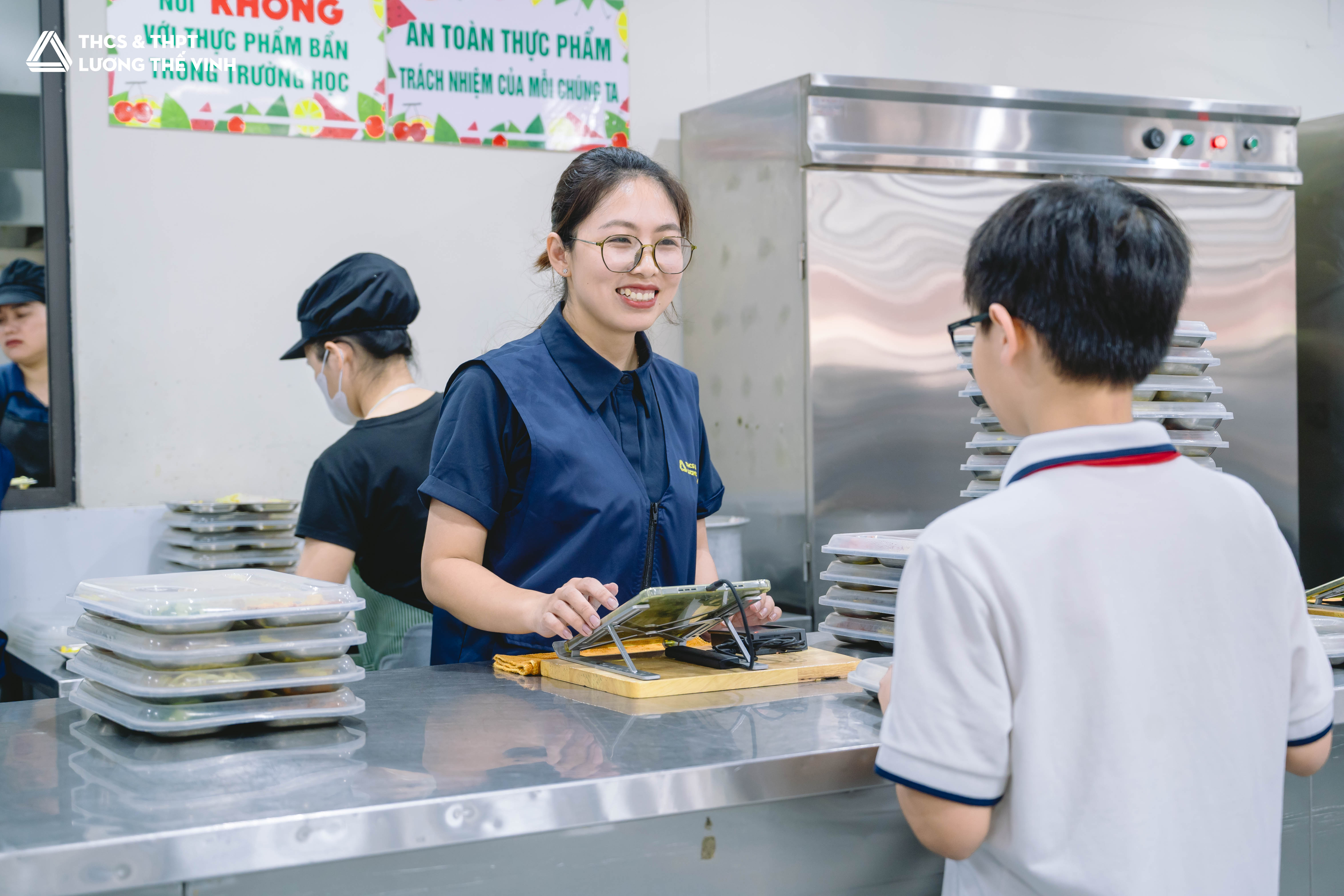 Ở một góc khác, cô Thanh Thủy – tổ trưởng bán trú đã dành trọn 10 năm thanh xuân cho từng bữa ăn, giấc ngủ của học trò. Giữa bộn bề công việc quản lý bán trú và chăm sóc học sinh, niềm hạnh phúc lớn nhất của cô là khi ngồi ăn cùng các em, lắng nghe những câu chuyện hồn nhiên, đôi khi ngô nghê mà ấm áp chẳng khác nào một gia đình. “Công việc vất vả đến đâu cũng đáng, vì tôi thấy mình như một người mẹ thứ hai của học trò,” – cô Thủy chia sẻ. Với cô, hạnh phúc đôi khi chỉ giản dị trong một lời chào lễ phép hay tiếng “con cảm ơn cô” chân thành của học trò. Những khoảnh khắc nhỏ bé ấy đủ để nhắc cô rằng công việc mình làm dù thầm lặng vẫn góp phần nuôi dưỡng sự trưởng thành của bao thế hệ. Chính niềm tin ấy khiến cô thêm yêu nghề, thêm gắn bó và tự hào khi được là một phần của mái nhà Lương Thế Vinh.