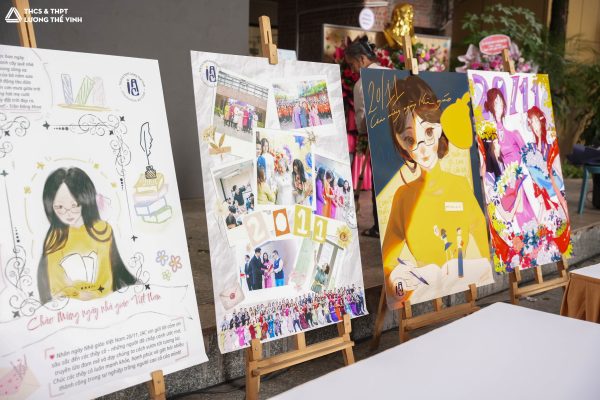 Trên sân khấu trường, các bức bích họa chủ đề “Người lái đò và hành trình gieo mầm tri thức” do CLB Mỹ thuật thực hiện đã góp thêm sắc màu ý nghĩa cho ngày lễ. Từng nét vẽ như một lời nhắc nhở nhẹ nhàng nhưng sâu sắc về sự tận tụy và kiên nhẫn của nghề giáo – thứ ánh sáng âm thầm nhưng bền bỉ nâng đỡ biết bao ước mơ của học trò.